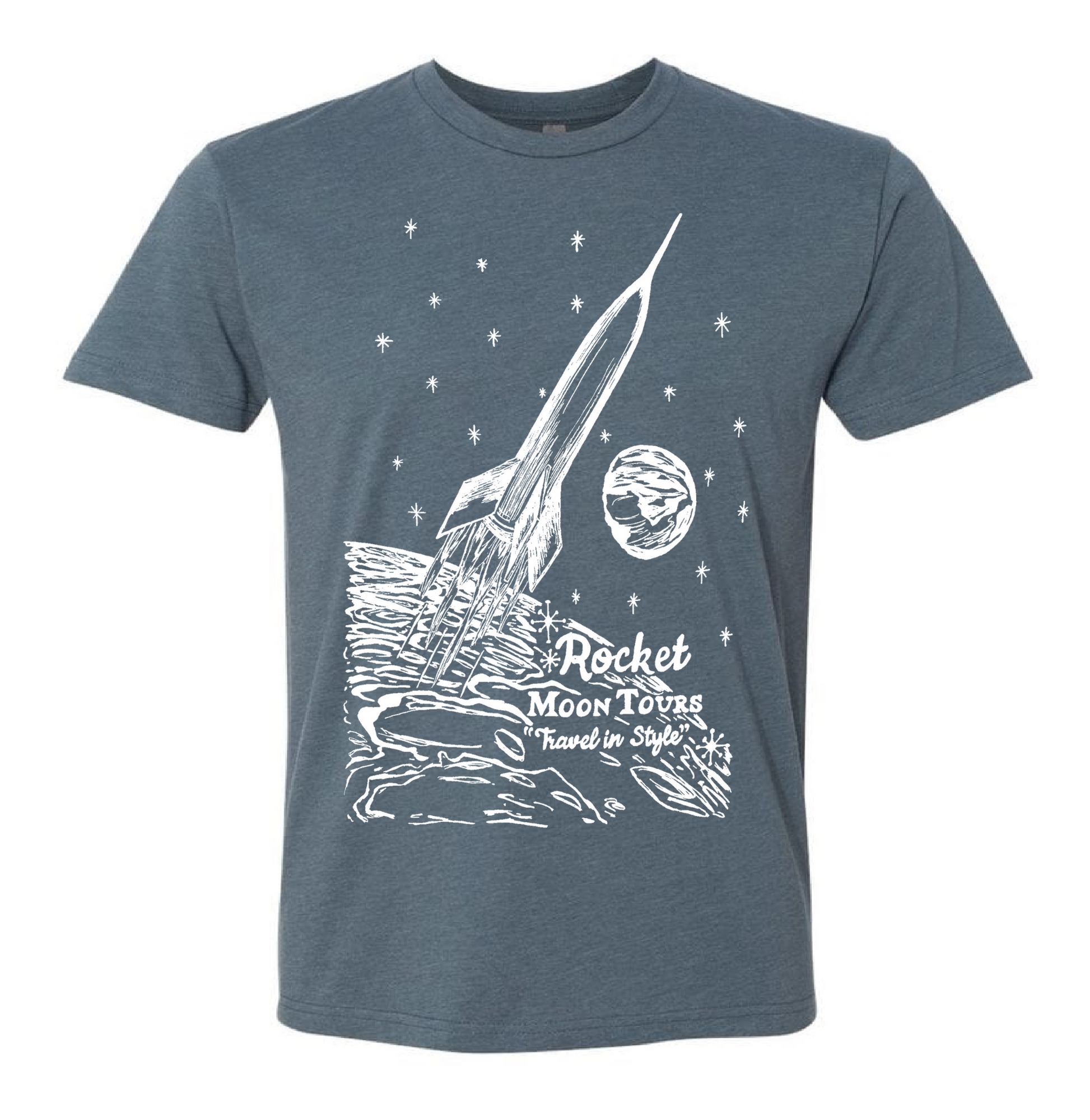 A vintage travel poster ad for Rocket Moon Tours, Travel in Style. So retro.