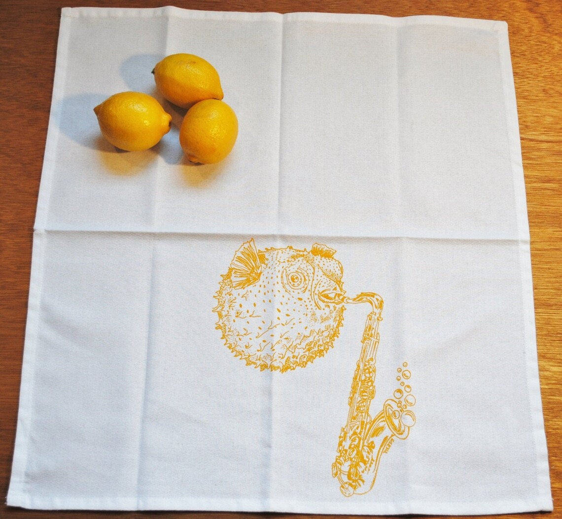Set of 4 assorted cloth napkins that are washable and reusable. These are printed in bright inks and feature images of a fish on a bicycle, snorkeling turtle, octopus ballet dancer, and blowfish playing saxophone.