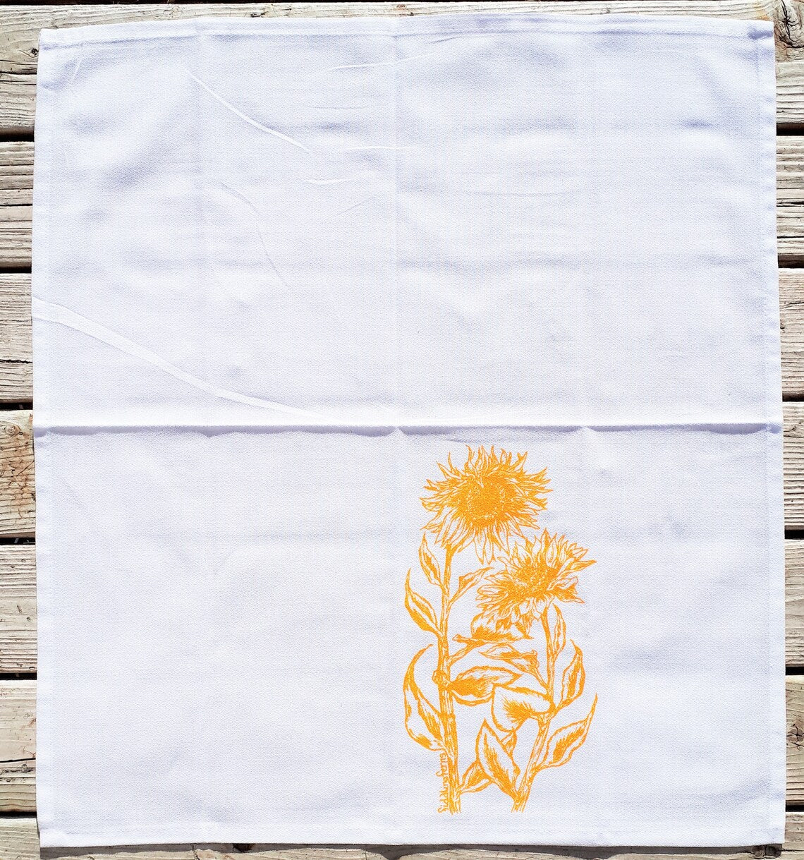 Set of 4 cloth napkins that are washable and reusable. These are printed in yellow ink and feature an image of sunflowers.