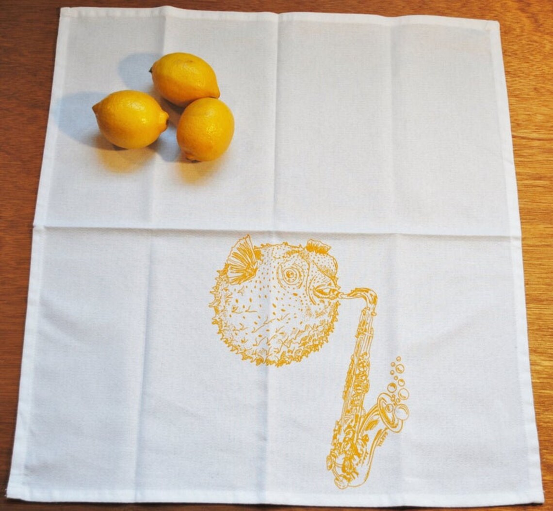 Set of 8 assorted cloth napkins that are washable and reusable. These feature an image of a purple pilot whale with pipe, sky blue pelican with rubber boots, blue whale with an umbrella, green snorkeling turtle, teal octopus ballet dancer, orange fish on a bike, yellow blowfish playing saxophone, and red lobster chef.