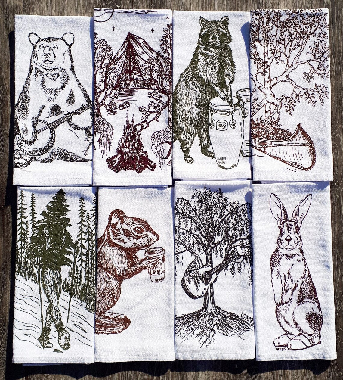 Set of 8 assorted cloth napkins that are washable and reusable. These are printed in darker, more muted colored inks and feature images of a banjo bear, raccoon drummer, bunny in slippers, chipmunk drinking coffee, birch in a birch bark canoe, trees camping, hiking tree, and weeping willow guitar tree.