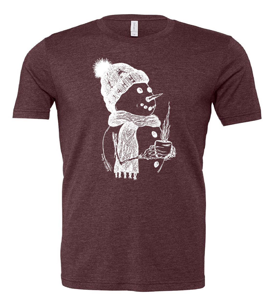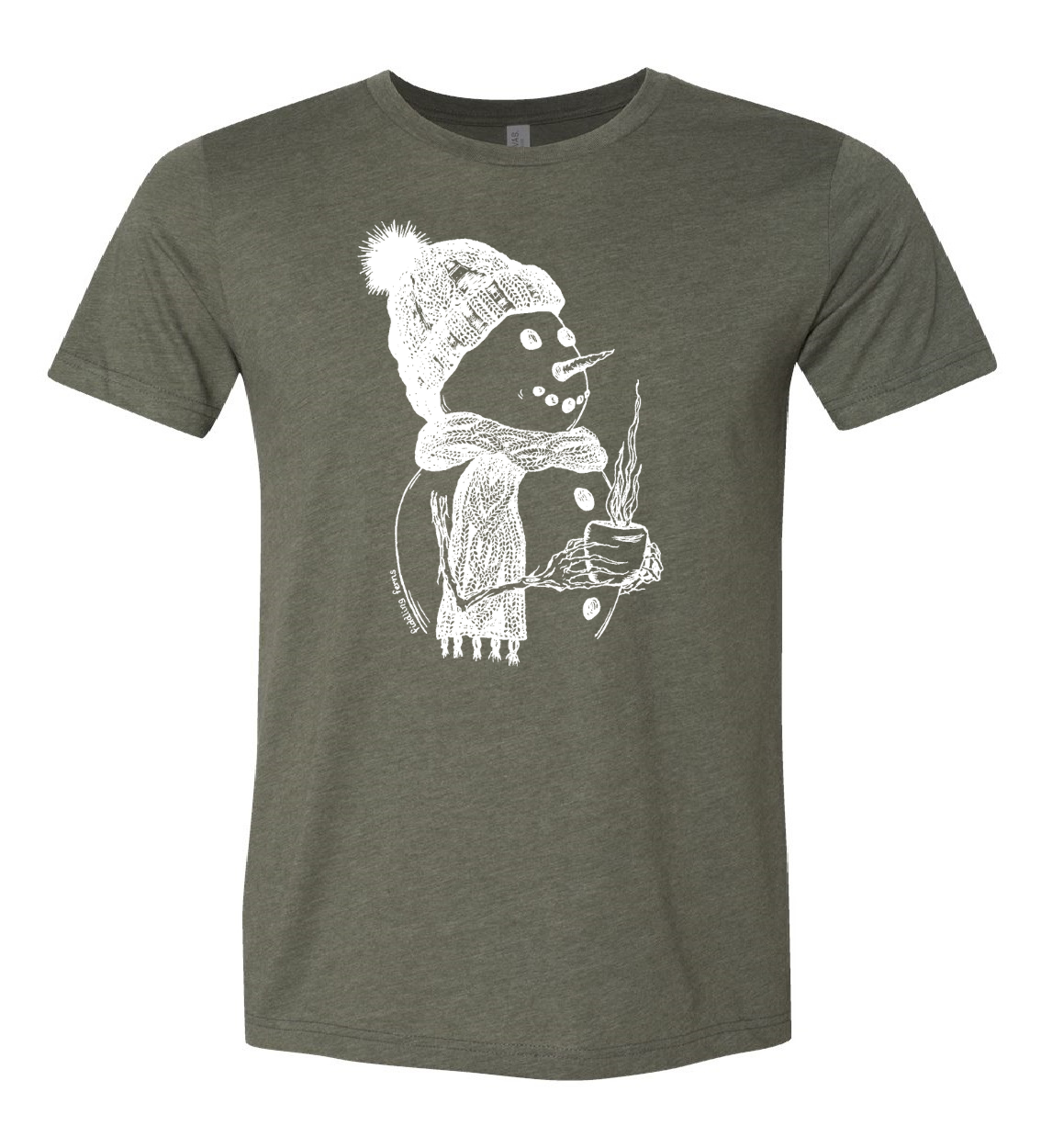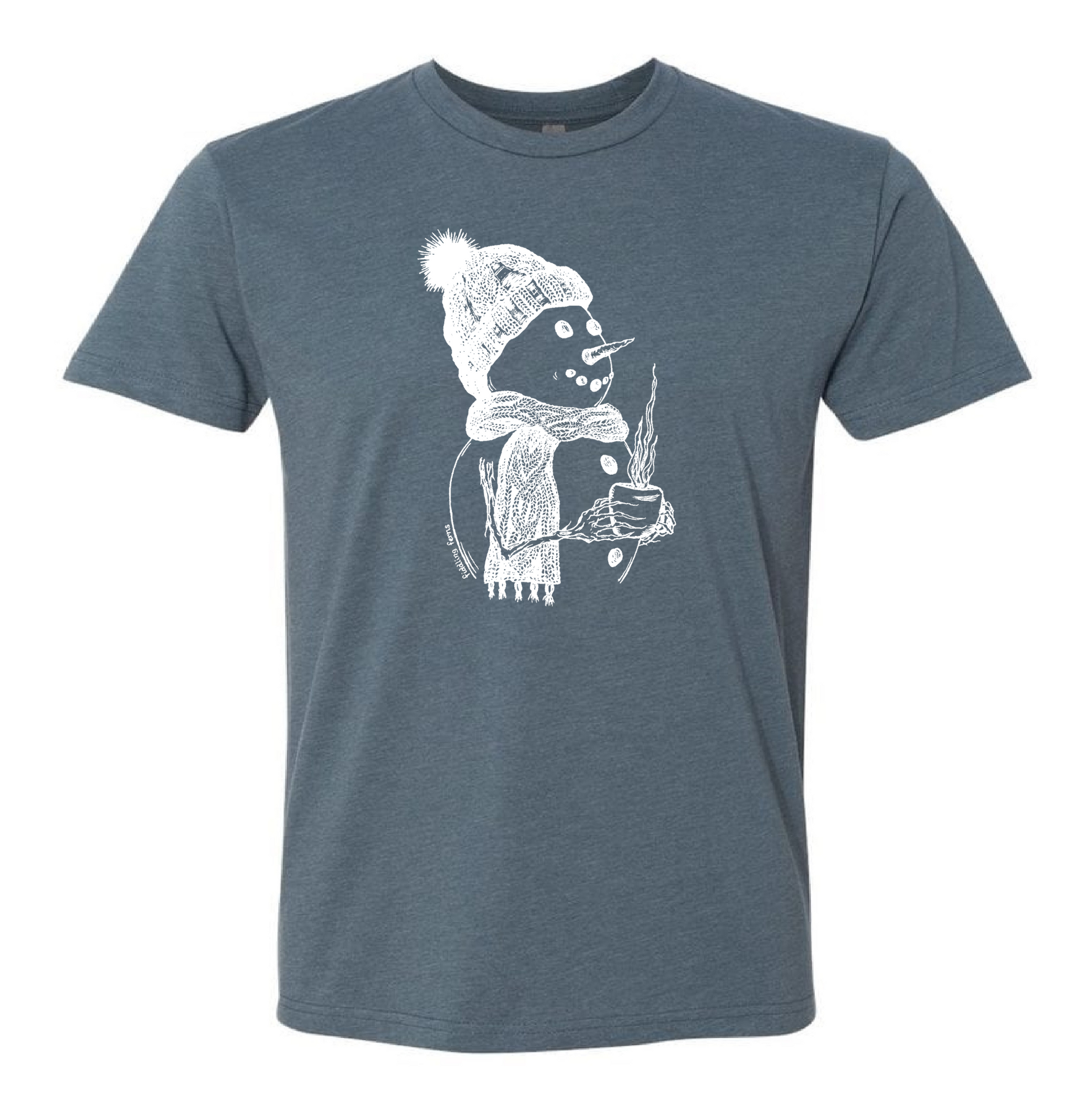Cold hands, warm heart. This snowman is enjoying a cup of coffee (or maybe hot chocolate) on a chilly winter day.